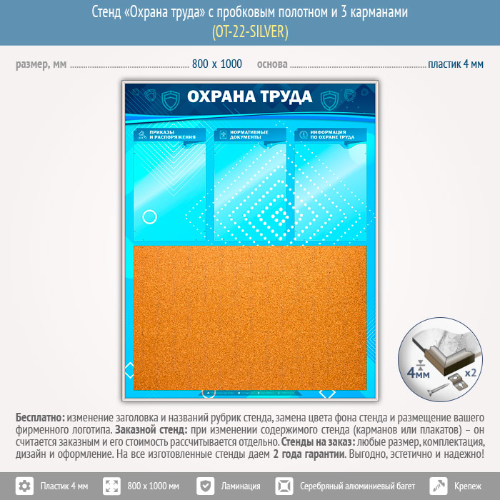 Стенд «Охрана труда» с пробковым полотном и 3 карманами (OT-22-SILVER) в Верее купить