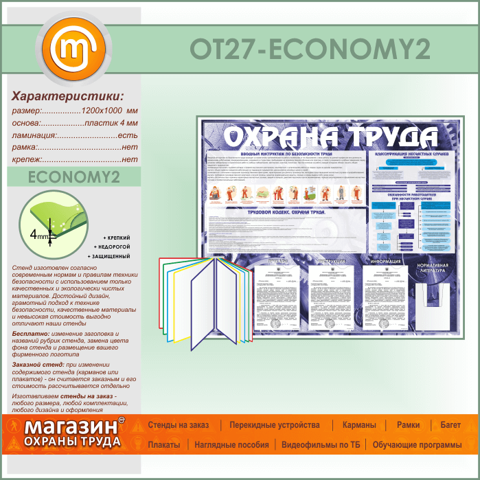 Стенд «Охрана труда» с перекидной системой, 3 плоскими и 1 объемным карманом (OT-27-ECONOMY2) в Верее купить