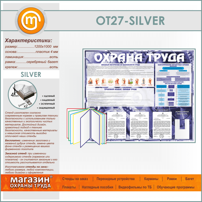 Стенд «Охрана труда» с перекидной системой, 3 плоскими и 1 объемным карманом (OT-27-SILVER) в Верее купить