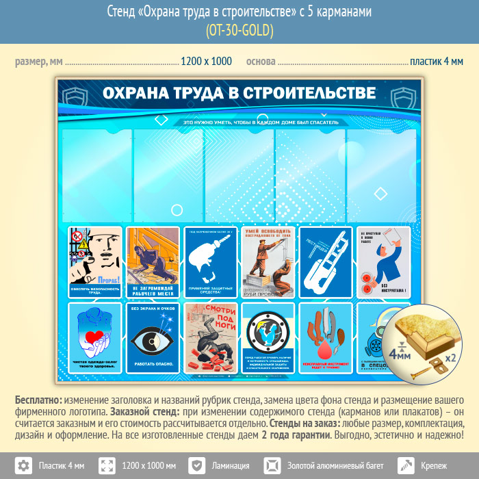 Стенд «Охрана труда в строительстве» с 5 карманами (OT-30-GOLD) в Верее купить