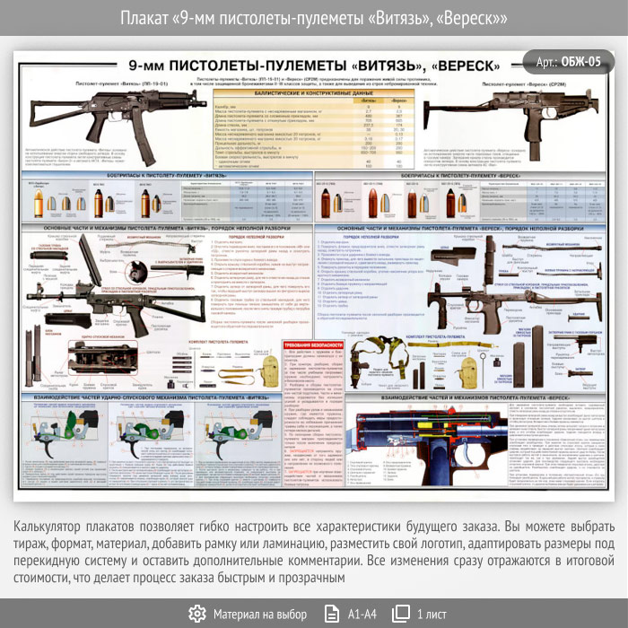 Плакат «9-мм пистолеты-пулеметы «Витязь», «Вереск»» (ОБЖ-05, 1 лист) в Верее купить
