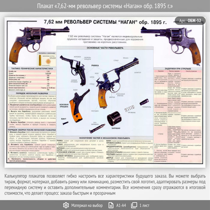Плакат «7,62-мм револьвер системы «Наган» обр. 1895 г.» (ОБЖ-32, 1 лист) в Верее купить