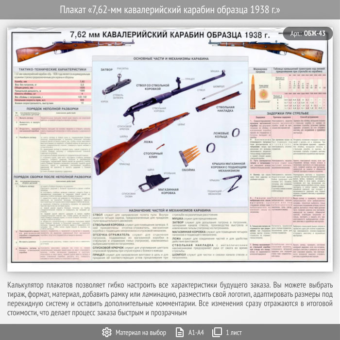 Плакат «7,62-мм кавалерийский карабин образца 1938 г.» (ОБЖ-43, 1 лист) в Верее купить