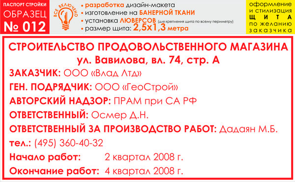 Паспорт стройки, образец № 12 (баннерная ткань, 2500х1300 cм) в Верее купить