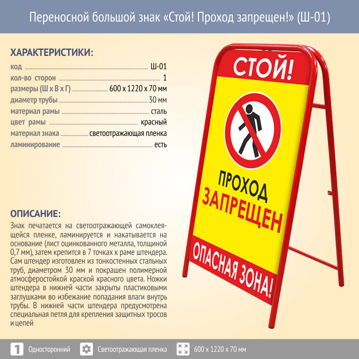 Переносной большой знак «Стой! Проход запрещен!» (Ш-01, односторонний, светоотражающая пленка) в Верее купить