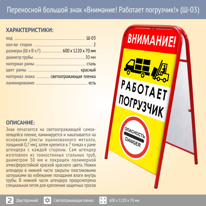 Переносной большой знак «Внимание! Работает погрузчик!» (Ш-03, двусторонний, светоотражающая пленка) в Верее купить