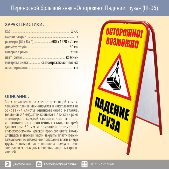 Переносной большой знак «Осторожно! Падение груза» (Ш-06, двусторонний, светоотражающая пленка) в Верее купить