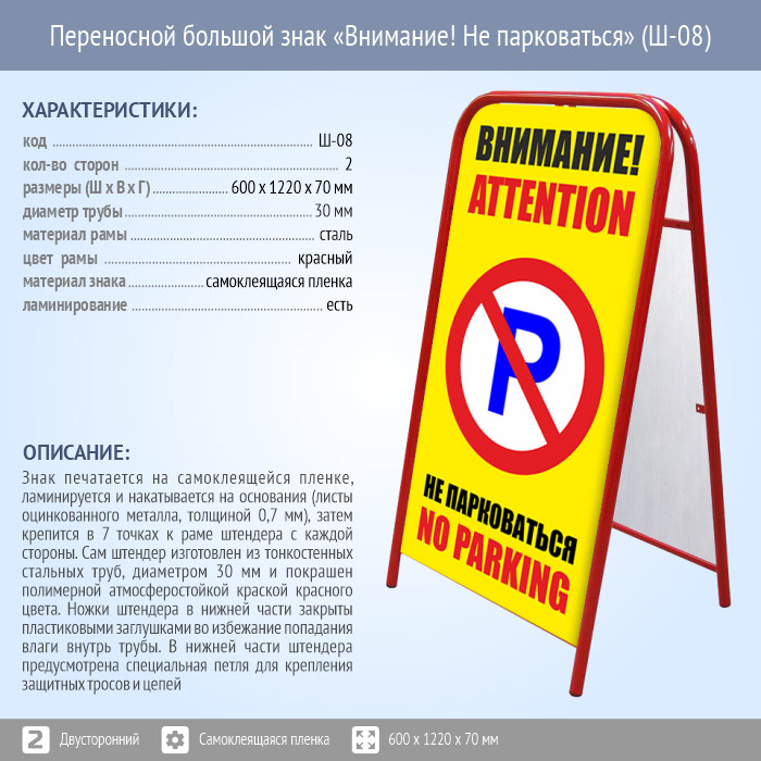 Переносной большой знак «Внимание! Не парковаться» (Ш-08, двусторонний, самоклеящаяся пленка) в Верее купить