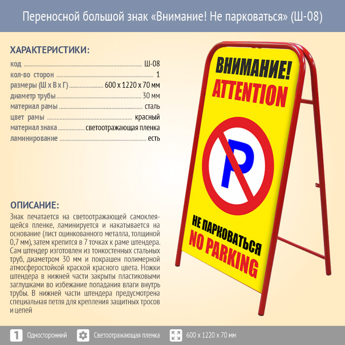 Переносной большой знак «Внимание! Не парковаться» (Ш-08, односторонний, светоотражающая пленка) в Верее купить