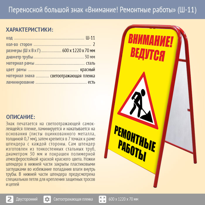 Переносной большой знак «Внимание! Ремонтные работы» (Ш-11, двусторонний, светоотражающая пленка) в Верее купить