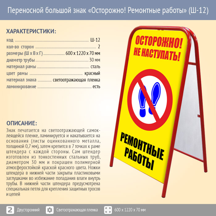 Переносной большой знак «Осторожно! Ремонтные работы» (Ш-12, двусторонний, светоотражающая пленка) в Верее купить
