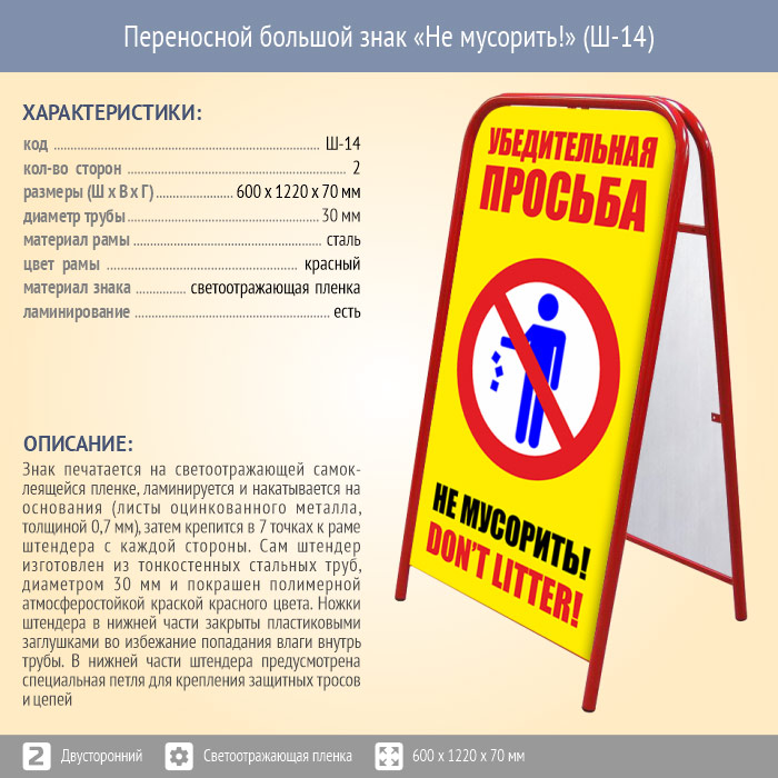 Переносной большой знак «Не мусорить!» (Ш-14, двусторонний, светоотражающая пленка) в Верее купить