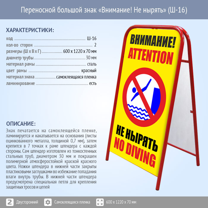 Переносной большой знак «Внимание! Не нырять» (Ш-16, двусторонний, самоклеящаяся пленка) в Верее купить