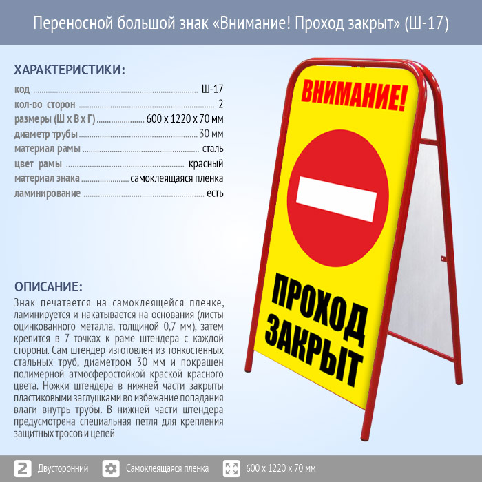 Переносной большой знак «Внимание! Проход закрыт» (Ш-17, двусторонний, самоклеящаяся пленка) в Верее купить