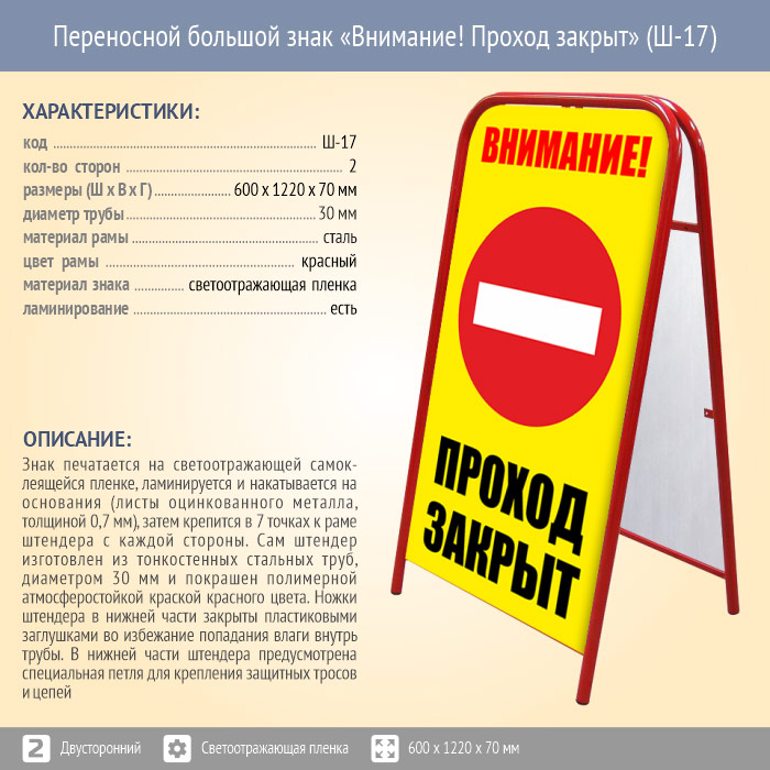 Переносной большой знак «Внимание! Проход закрыт» (Ш-17, двусторонний, светоотражающая пленка) в Верее купить