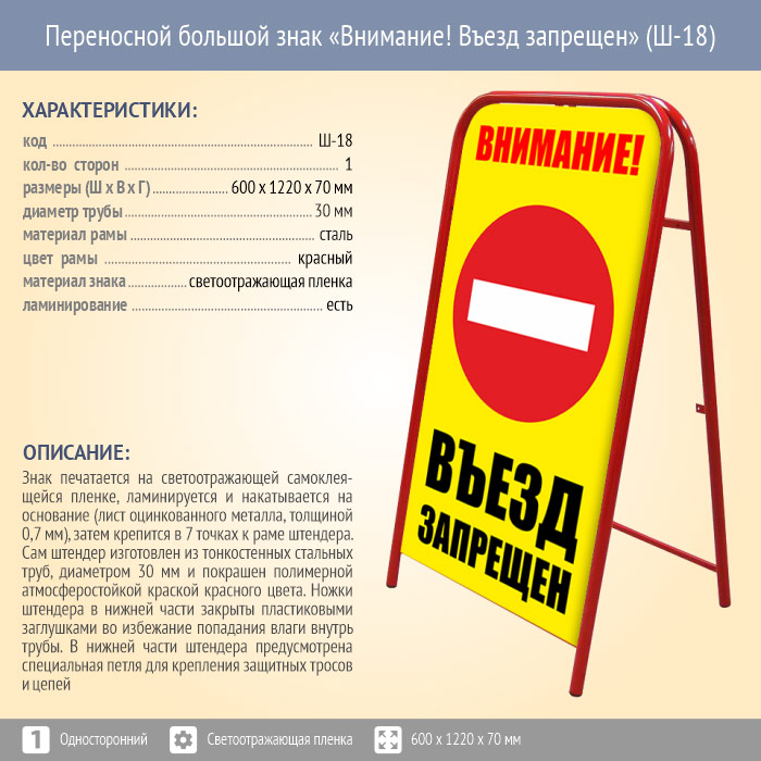 Переносной большой знак «Внимание! Въезд запрещен» (Ш-18, односторонний, светоотражающая пленка) в Верее купить