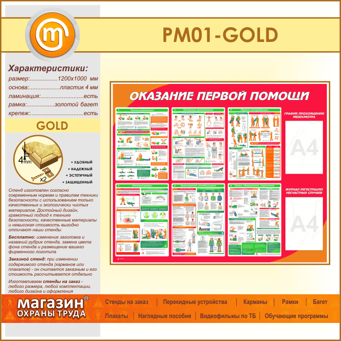 Стенд «Оказание первой помощи» с плоским и объемным карманами (PM-01-GOLD) в Верее купить