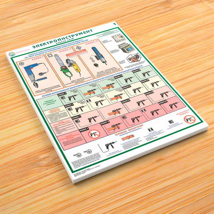- 1 Плакат – Классы электрифицированного инструмента по типу защиты от поражения электрическим током, условия использования электроинструмента различных классов и электрозащитных средств