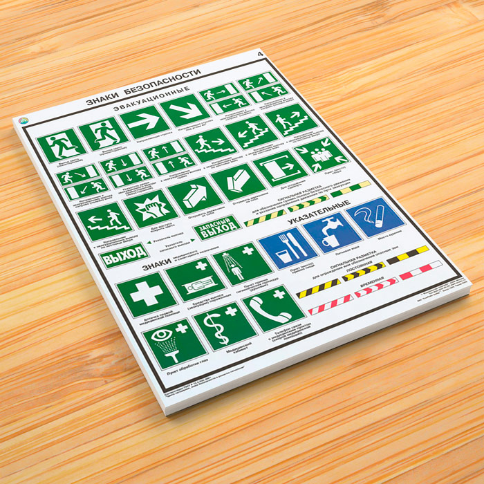 - Плакат с эвакуационными знаками, знаками медицинского и санитарного назначения, указательными знаками и сигнальной разметкой