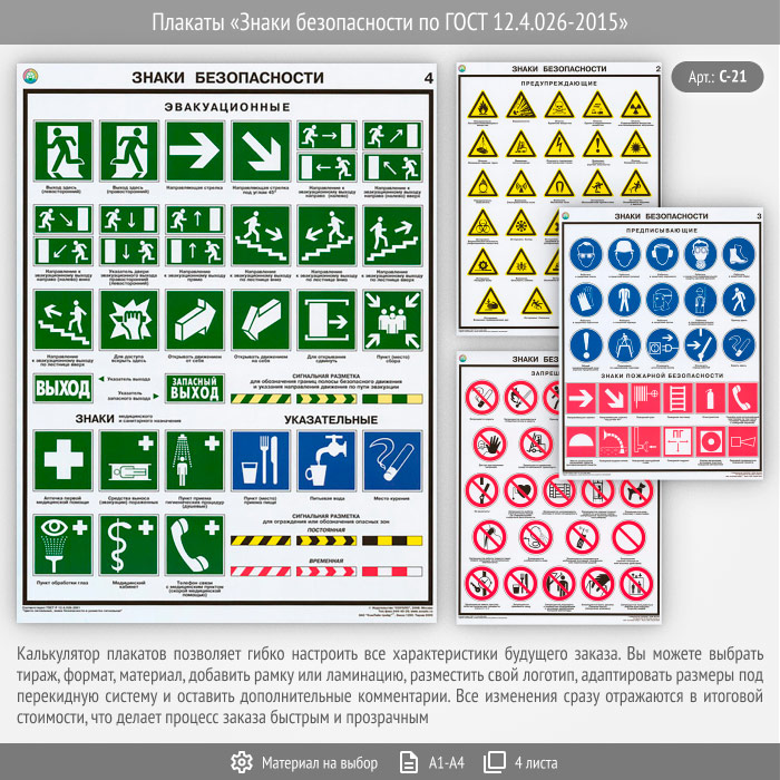 Плакаты «Знаки безопасности по ГОСТ 12.4.026-2015» (С-21, 4 листа)