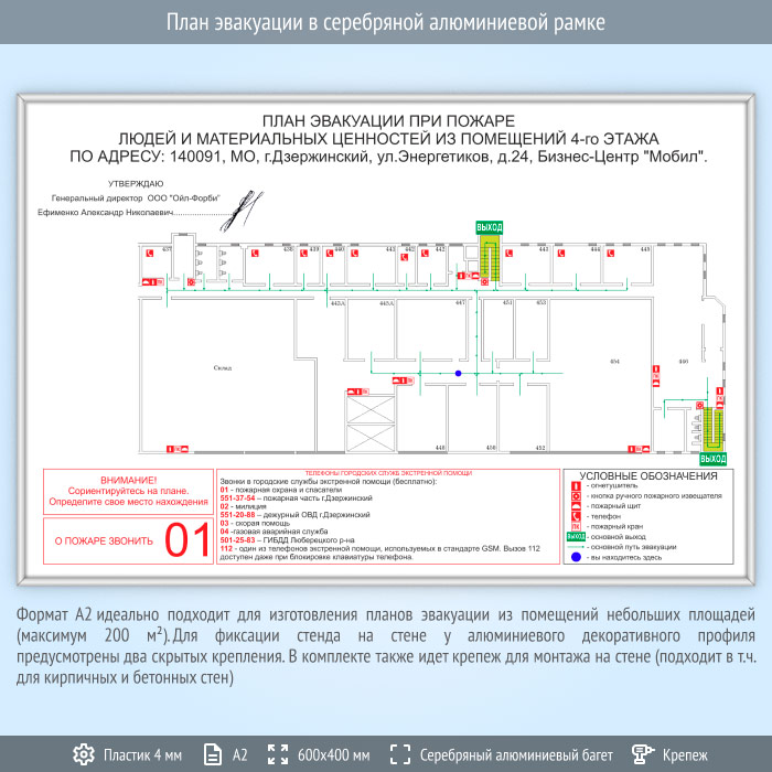 План эвакуации в серебряной алюминиевой рамке (А2 формат) в Верее купить