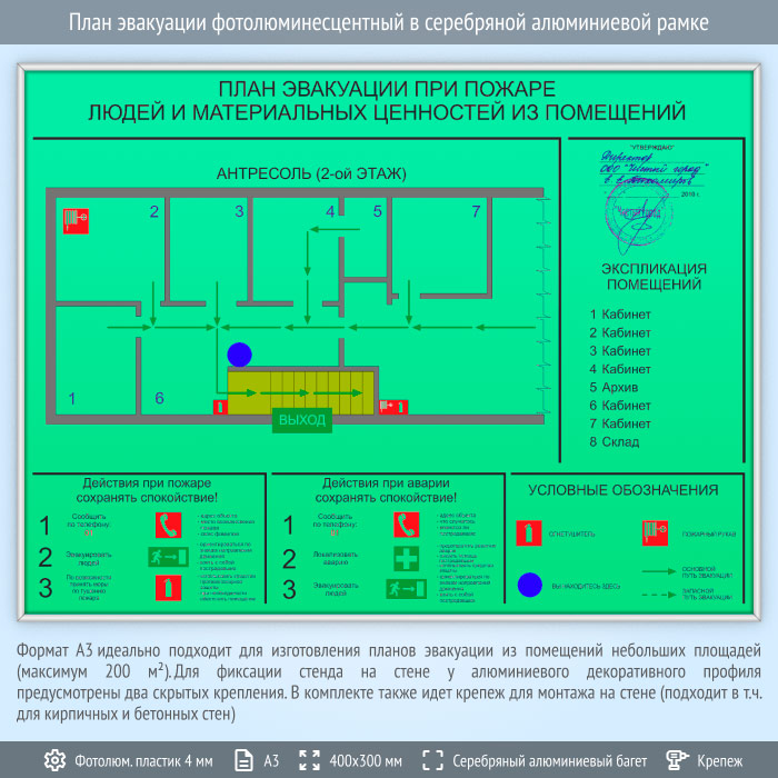 План эвакуации фотолюминесцентный в серебряной алюминиевой рамке (А3 формат) в Верее купить