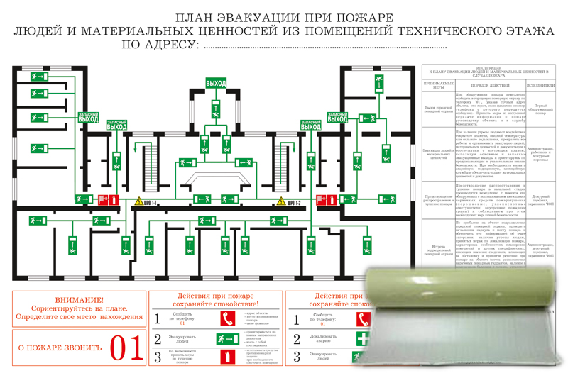 РЕДКИЙ ФОРМАТ Подходит для изготовления планов эвакуации больших площадей (до 1000 кв.м) с большим количеством пожарного инвентаря. Содержит схематичное изображение помещений с размещенными на нем средствами пожаротушения и извещения, путями эвакуации и условные обозначения. Содержит инструкцию при пожаре |
