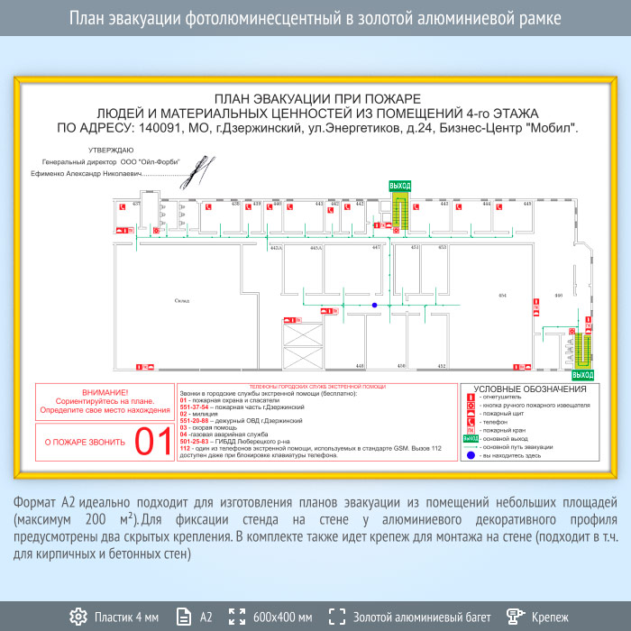 План эвакуации в золотой алюминиевой рамке (А2 формат) в Верее купить
