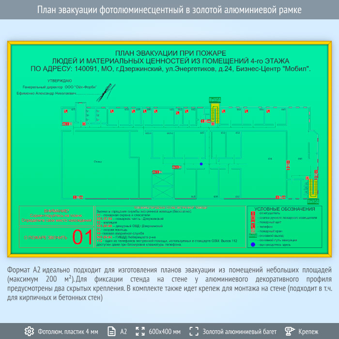 План эвакуации фотолюминесцентный в золотой алюминиевой рамке (А2 формат) в Верее купить