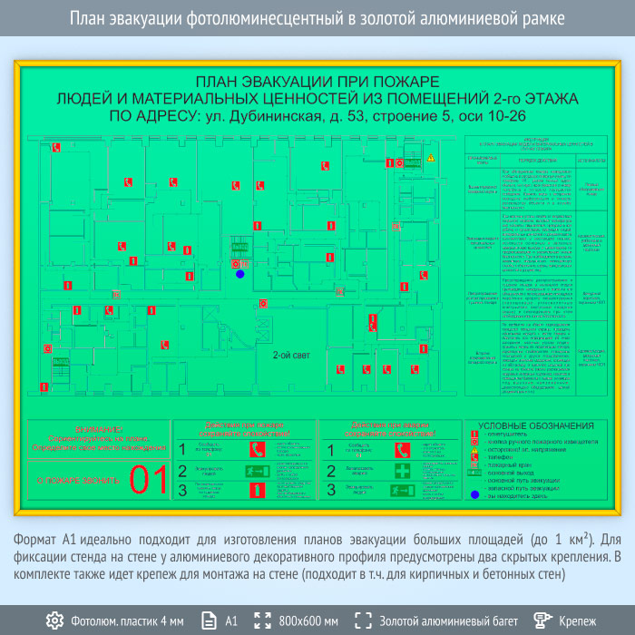 План эвакуации фотолюминесцентный в золотой алюминиевой рамке (А1 формат) в Верее купить