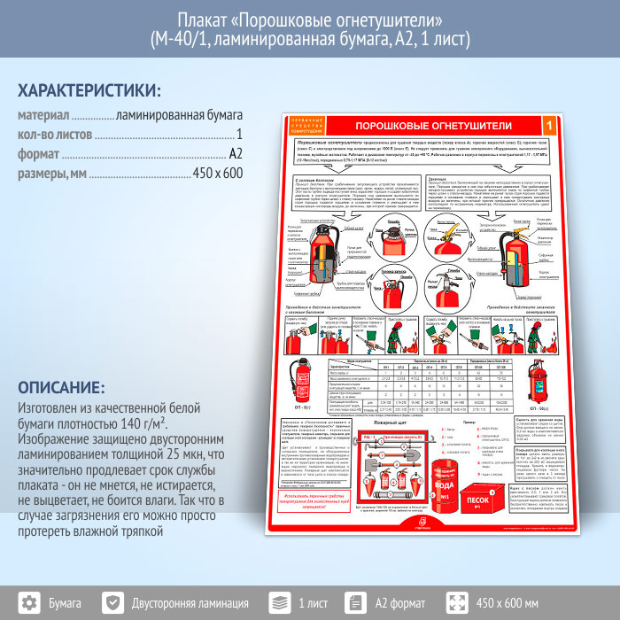 Плакат «Порошковые огнетушители» (М-40/1, ламинированная бумага, А2, 1 лист) в Верее купить