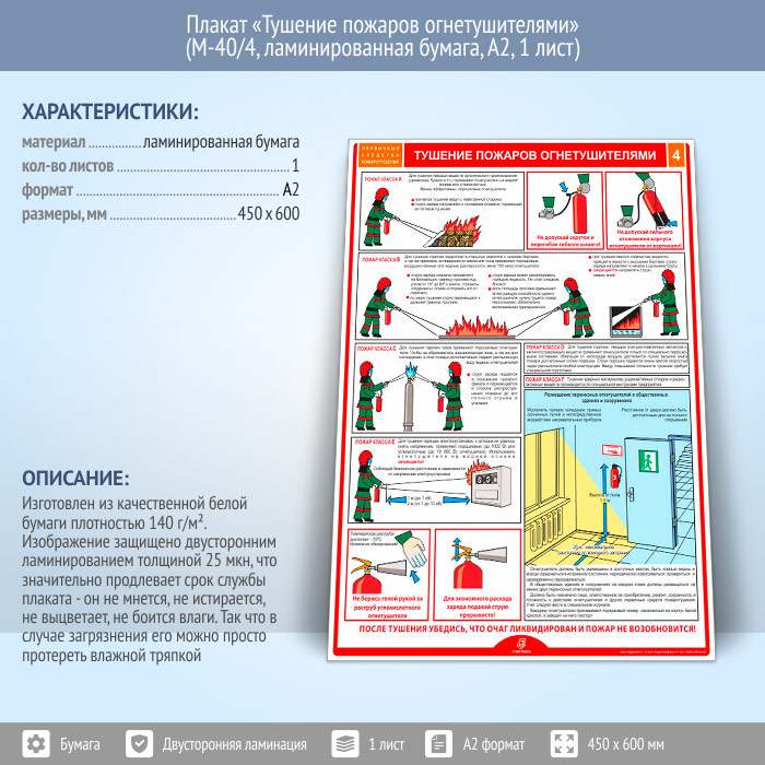 Плакат «Тушение пожаров огнетушителями» (М-40/4, ламинированная бумага, А2, 1 лист) в Верее купить