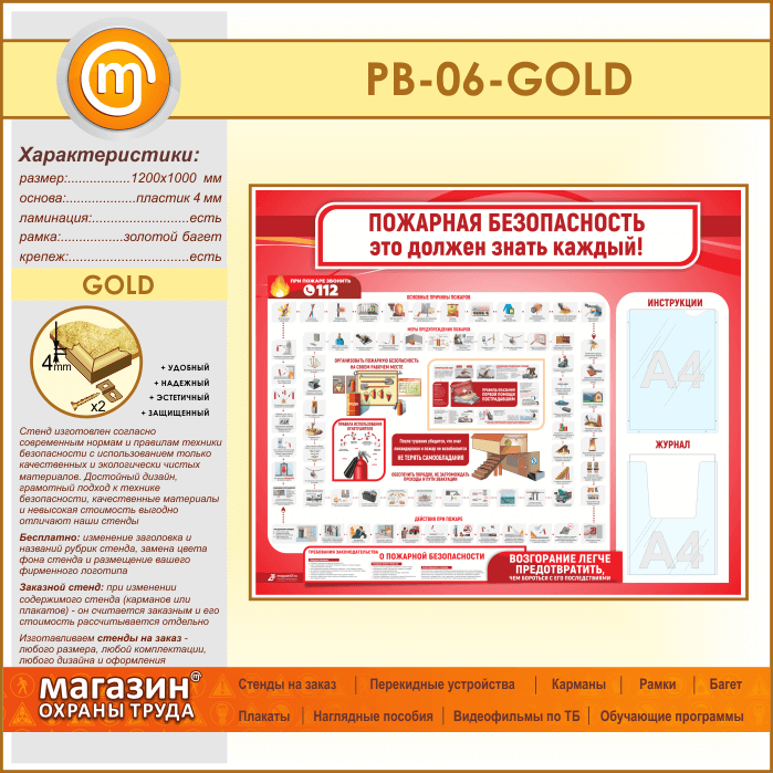Стенд «Пожарная безопасность. Это должен знать каждый» с плоским и объемным карманами (PB-06-GOLD) в Верее купить