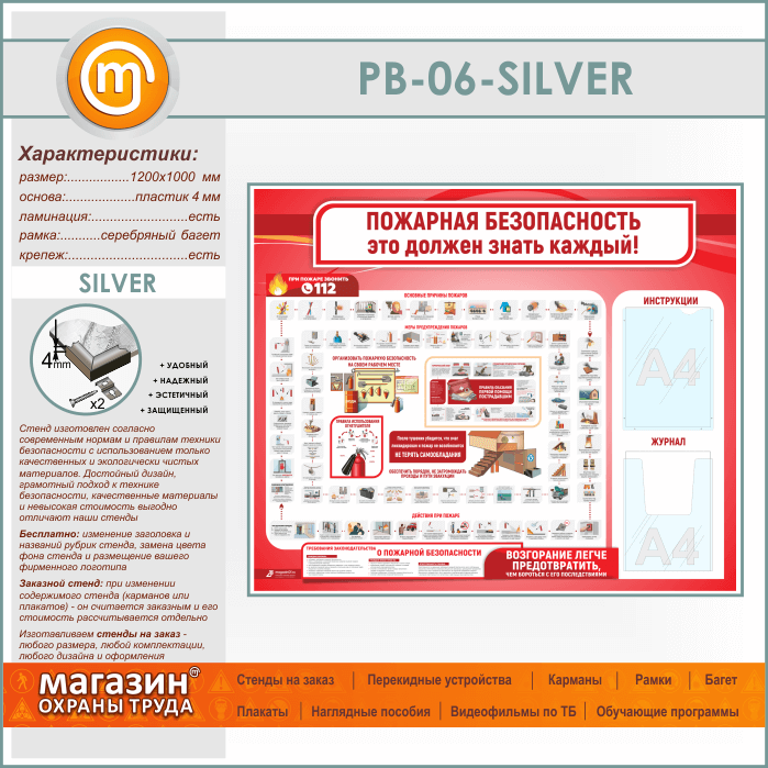 Стенд «Пожарная безопасность. Это должен знать каждый» с плоским и объемным карманами (PB-06-SILVER) в Верее купить