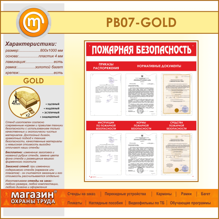 Стенд «Пожарная безопасность» с 6 карманами (PB-07-GOLD) в Верее купить