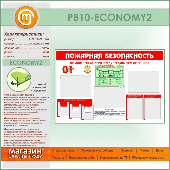 Стенд «Пожарная безопасность» с планом эвакуации, 5 плоскими и 3 объемными карманами (PB-10-ECONOMY2) в Верее купить