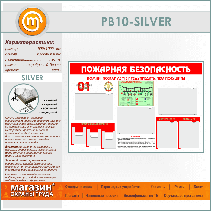 Стенд «Пожарная безопасность» с планом эвакуации, 5 плоскими и 3 объемными карманами (PB-10-SILVER) в Верее купить