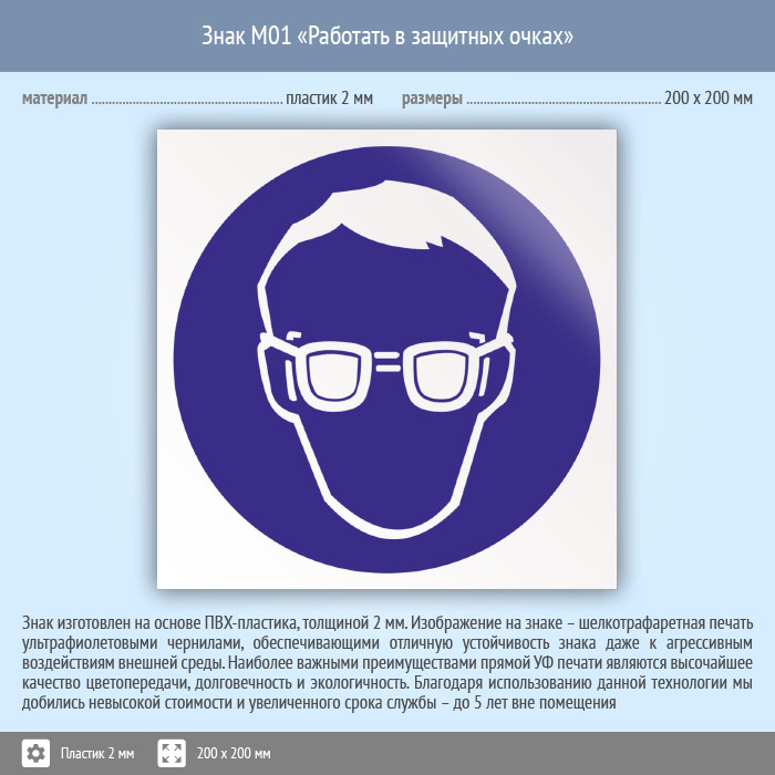 Знак M01 «Работать в защитных очках» (пластик, 200х200 мм) в Верее купить