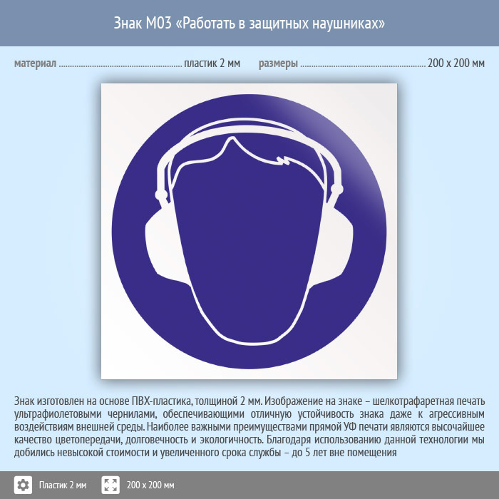 Знак M03 «Работать в защитных наушниках» (пластик, 200х200 мм) в Верее купить