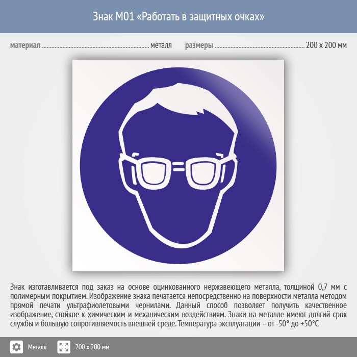 Знак M01 «Работать в защитных очках» (металл, 200х200 мм) в Верее купить