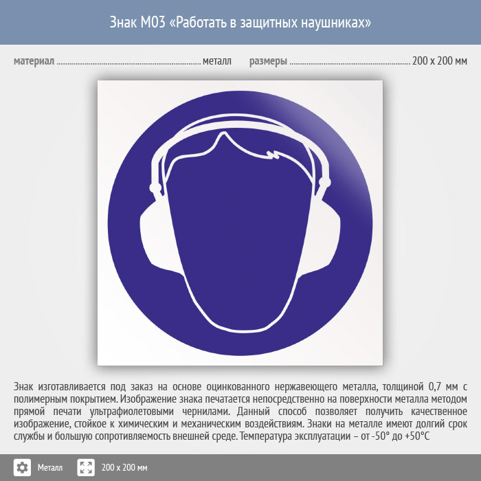 Знак M03 «Работать в защитных наушниках» (металл, 200х200 мм) в Верее купить