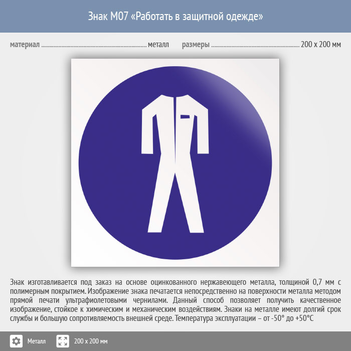 Знак M07 «Работать в защитной одежде» (металл, 200х200 мм) в Верее купить