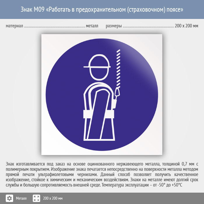 Знак M09 «Работать в предохранительном (страховочном) поясе» (металл, 200х200 мм) в Верее купить