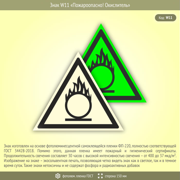 Знак W11 «Пожароопасно! окислитель» (фотолюминесцентная пленка ГОСТ 34428-2018, сторона 150 мм) в Верее купить