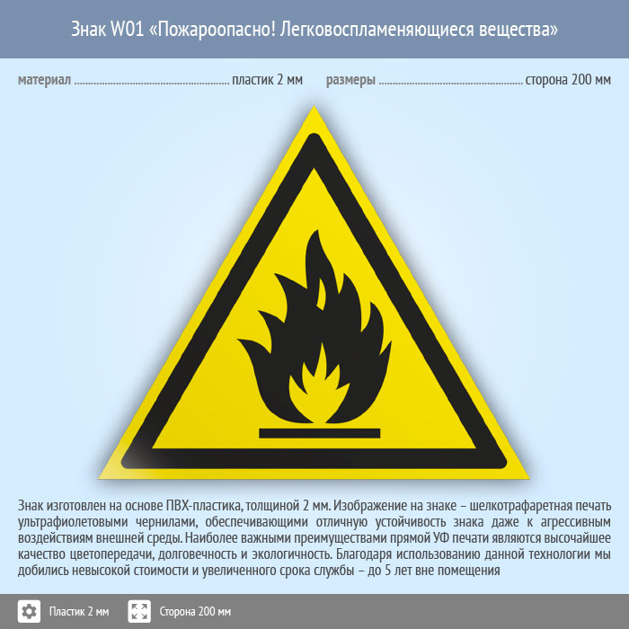 Знак W01 «Пожароопасно! легковоспламеняющиеся вещества» (пластик, сторона 200 мм) в Верее купить