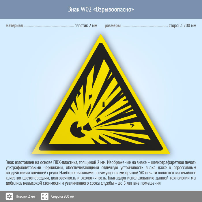 Знак W02 «Взрывоопасно» (пластик, сторона 200 мм) в Верее купить