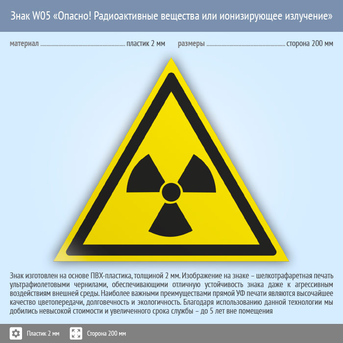 Знак W05 «Опасно! радиоактивные вещества или ионизирующее излучение» (пластик, сторона 200 мм) в Верее купить
