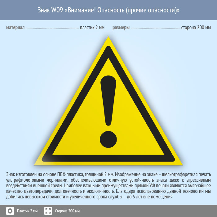 Знак W09 «Внимание! опасность (прочие опасности)» (пластик, сторона 200 мм) в Верее купить