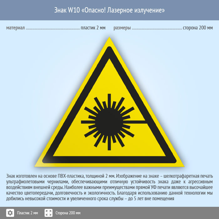 Знак W10 «Опасно! лазерное излучение» (пластик, сторона 200 мм) в Верее купить