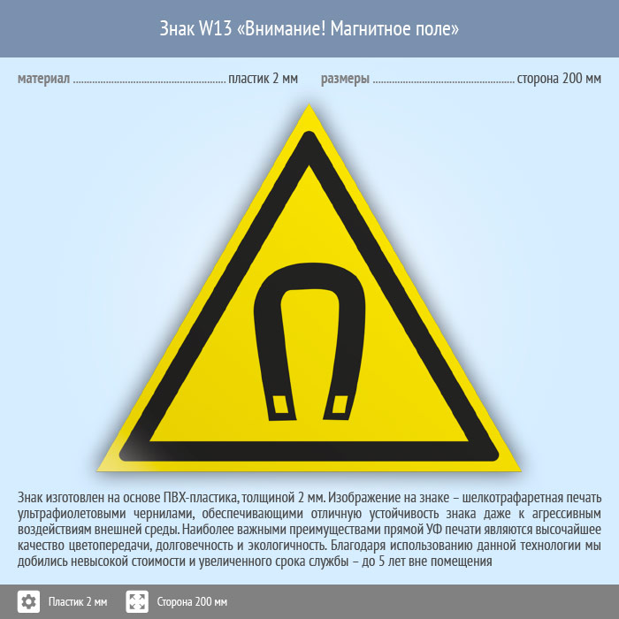 Знак W13 «Внимание! магнитное поле» (пластик, сторона 200 мм) в Верее купить